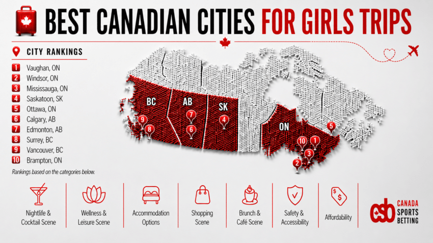 Canada’s strongest girls’ trip destinations are clustered across Ontario, Alberta, British Columbia and Saskatchewan. As a result, the ranking shows where weekend-friendly city breaks are most concentrated.