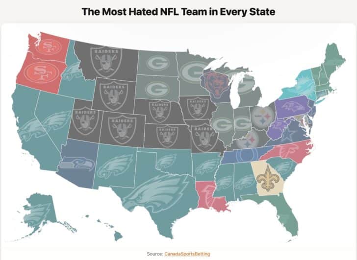 - The Las Vegas Raiders follow closely, hated in 8 states, mainly across the Mountain West and Midwest.